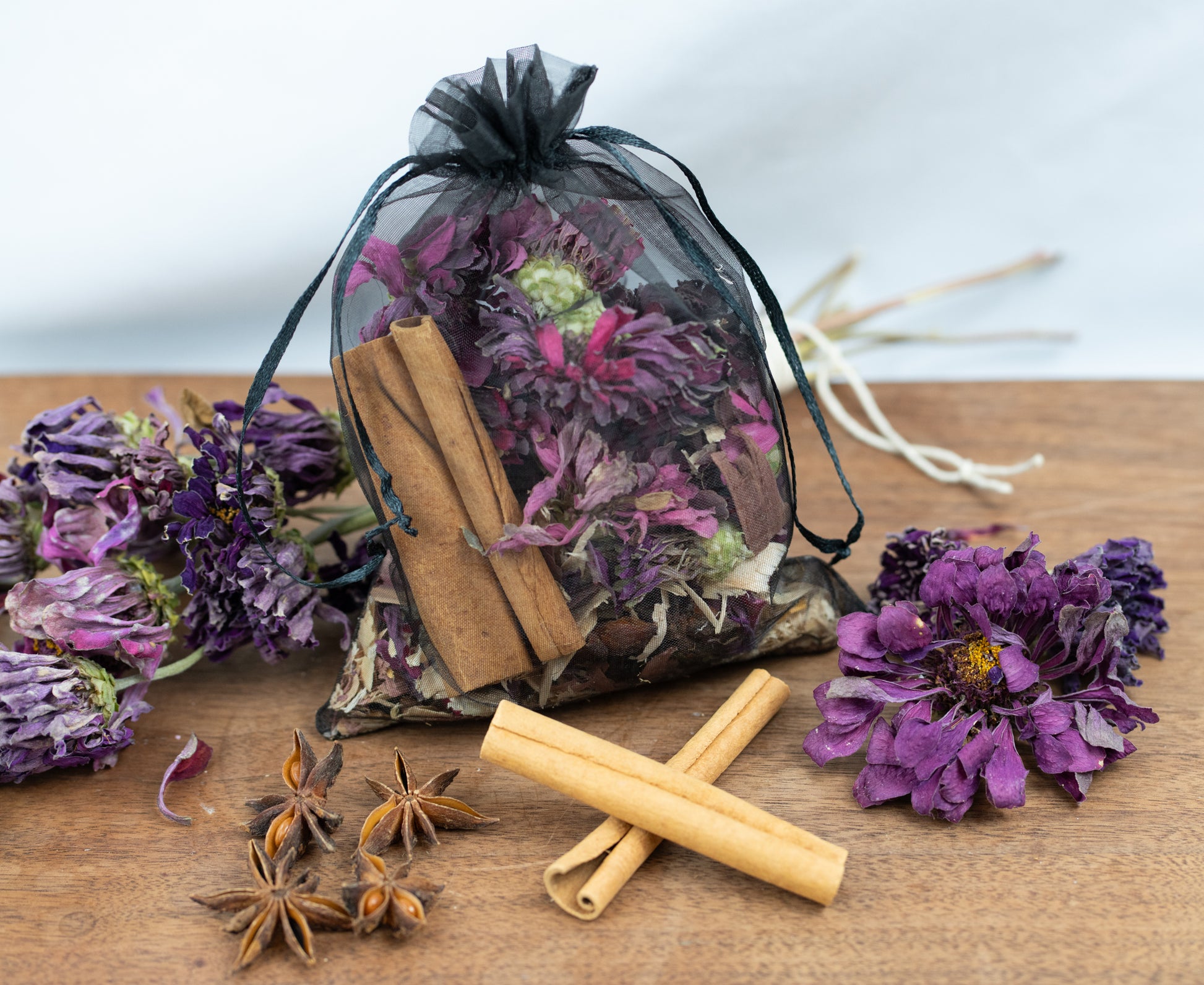 A seasonal potpourri blend crafted to honor the passage into autumn. Each sachet is filled with homegrown dried zinnias, warm cedar shavings, star anise, cinnamon sticks, and whole cloves- ingredients chosen to embody the fall and the comforting quiet of shorter days.